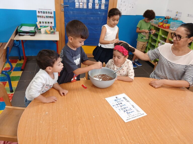 Jeudi 25 septembre, les élèves ont confectionné des gâteaux au chocolat pour les anniversaires. Inass joue le rôle du marchand et sert ses clients. Chaque élève est responsable d’aller au magasin chercher son ingrédient. Bonjour je voudrais trois oeufs. Merci