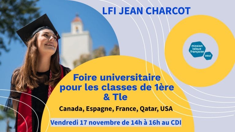 Le vendredi 17 novembre, le Centre d’information et d’orientation du LFI Jean Charcot accueille 9 universités internationales (Canada, Espagne, France, Qatar et USA). La foire universitaire se tiendra au CDI de 14h à 16h pour les élèves de 1ère et…