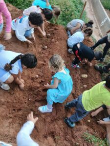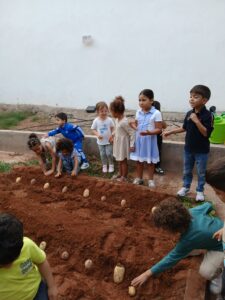 Au jardin pédagogique, nous commençons nos plantations de legumes du potager : plantations de nos pommes de terre, semis de carottes, navets, poireaux et choux. Les enfants préparent la terre, plantent, recouvrent de terre, arrosent. Abdelatif, agent à l’école, nous partage son savoir-faire, aide les enfants et assure le suivi des plantations. Nous reviendrons régulièrement au jardin pédagogique pour constater l’avancer de notre potager. Bravo les petits jardiniers !
