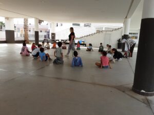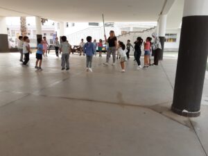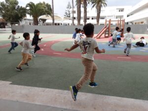 Le nouveau jeu cette fois-ci est le jeu de la fée. La fée tient un bâton et, suivant les gestes qu’elle fait, différentes consignes sont à suivre : s’asseoir, sauter, tourner sur soi-même ou …se sauver dans la partie bleue de la cour. Ensuite on se replace en ronde sous le préau et le jeu reprend. Attention aux erreurs de consignes. Il faut être vigilant !