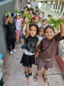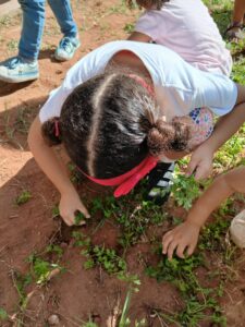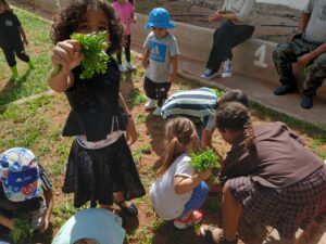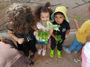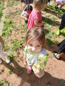 Lors de la première visite au jardin pédagogique, les enfants ont cueilli de la coriandre.