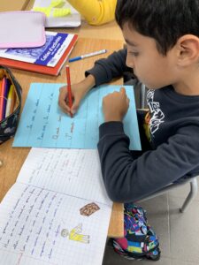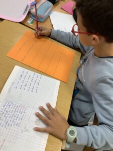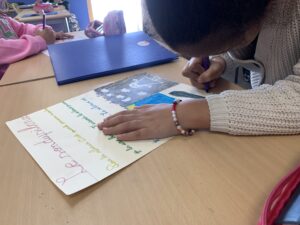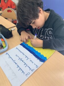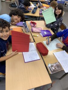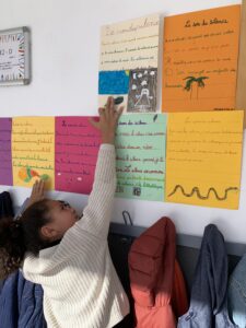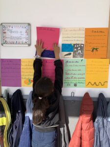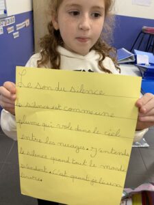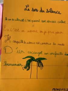 Nous avons commencé avec le premier album de notre sélection des Incorruptibles : Le Son du Silence de Katrina Goldsaito. Les élèves ont suivi Yoshio, un garçon à Tokyo, à la recherche du mystérieux “son du silence”. Chacun a ensuite exprimé son ressenti et imaginé son propre “son du silence”. Ces créations ont été travaillées en production d’écrits, puis mises en valeur sur des affiches illustrées. Les élèves sont très fiers de voir leurs œuvres décorer l’entrée de la classe, apportant ainsi une touche de créativité et de poésie à notre quotidien.