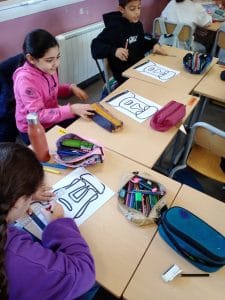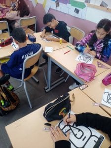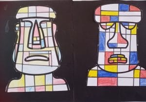 Pour la semaine des mathématiques, les CM1B ont lié la géométrie avec l’histoire des arts et l’art visuel : ils ont décoré des Moaï, les légendaires statues de l’Île de Pâques étudiées en histoire des arts, à la façon de l’artiste Piet Mondrian. Pour cela, ils ont traçé des droites parallèles et perpendiculaires à l’intérieur de ces visages, et rempli certaines cases en bleu, jaune et rouge. Pour un rendu optimal, ils ont collé leur production sur un fond noir. Le résultat final sera affiché sur la porte de la classe !